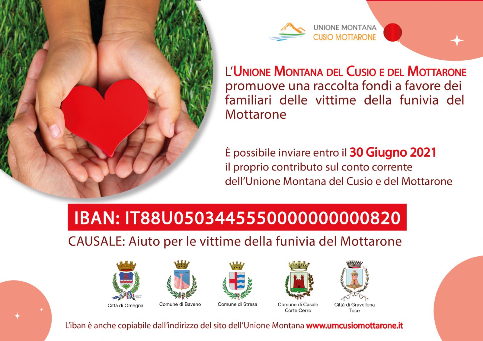 I Comuni di Casale Corte Cerro, Baveno, Gravellona Toce, Omegna e Stresa, facenti parte dell’Unione Montana del Cusio e del Mottarone, si stringono attorno ai familiari delle vittime della Funivia Stresa-Mottarone e promuovono insieme una raccolta fondi a cui ciascuno potrà partecipare versando, anche solo un piccolo contributo, sul conto corrente dell’Unione Montana.