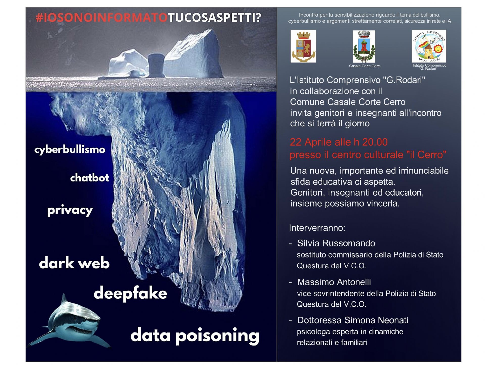 L'Istituto Comprensivo "G. Rodari", in collaborazione con il Comune di Casale Corte Cerro, promuove un incontro dedicato a temi oggi più che mai centrali: bullismo, cyberbullismo, sicurezza in rete e nuove sfide legate all'intelligenza artificiale.