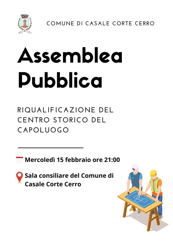 L'Amministrazione invita i cittadini a partecipare all'Assemblea Pubblica di mercoledì 15 febbraio dalle 21 presso la Sala Consiliare del Comune per illustrare i lavori di riqualificazione del Centro Storico del Capoluogo.