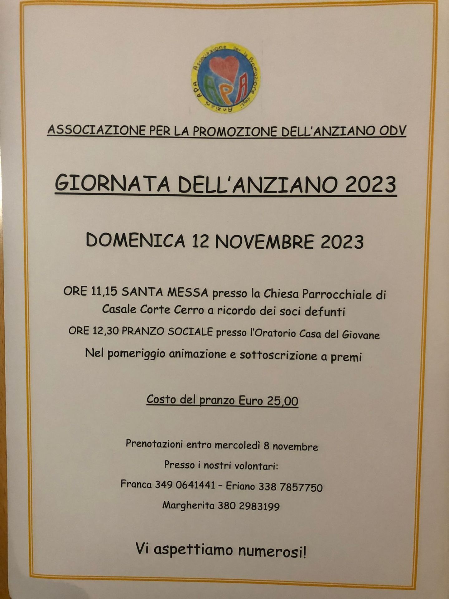 ore 12.30: Pranzo Sociale presso l'Oratorio Casa del Giovane