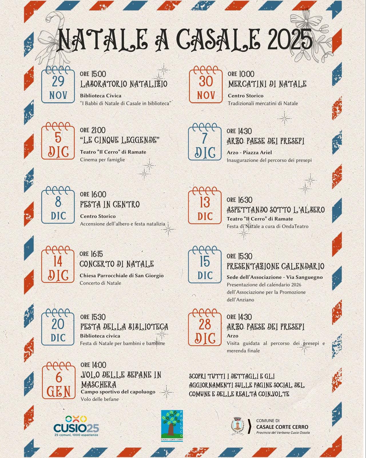 Il programma “Natale a Casale 2025” raccoglie un ricco calendario di iniziative promosse dal Comune di Casale Corte Cerro, dalla Pro Loco e dalle associazioni del territorio.