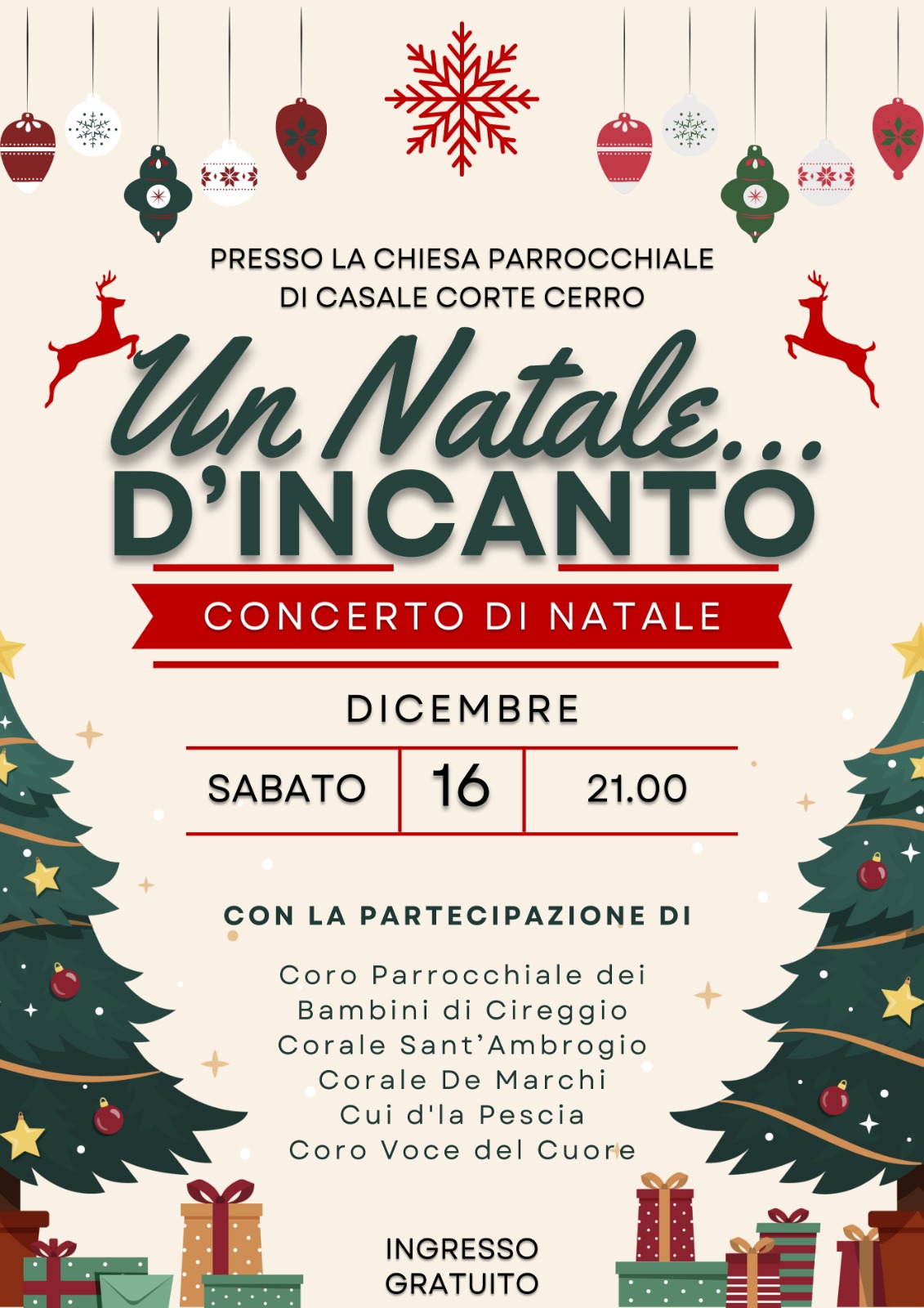 Sabato 16 dicembre alle ore 21.00, presso la Chiesa Parrocchiale di Casale Corte Cerro, il Concerto di Natale: UN NATALE D'INCANTO.