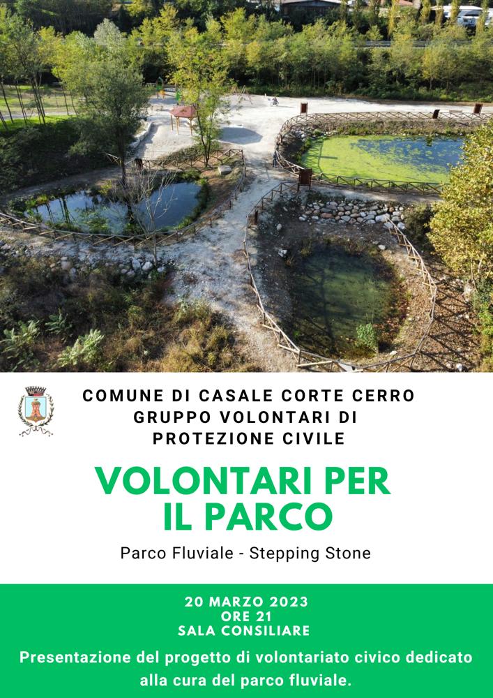 Si terrà lunedì 20 marzo, alle ore 21.00 presso la Sala Consiliare, la presentazione del progetto "VOLONTARI PER IL PARCO", ideato in collaborazione tra l'Amministrazione Comunale e i volontari del gruppo di Protezione Civile Casale Corte Cerro.